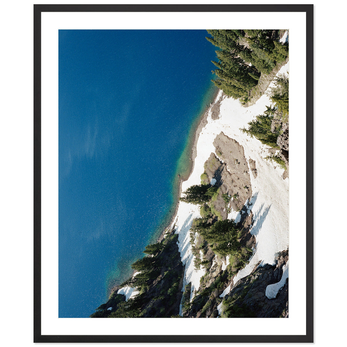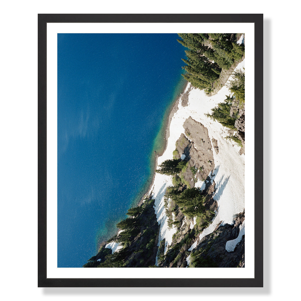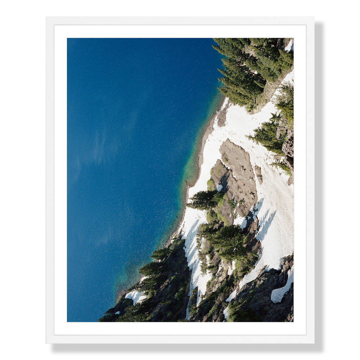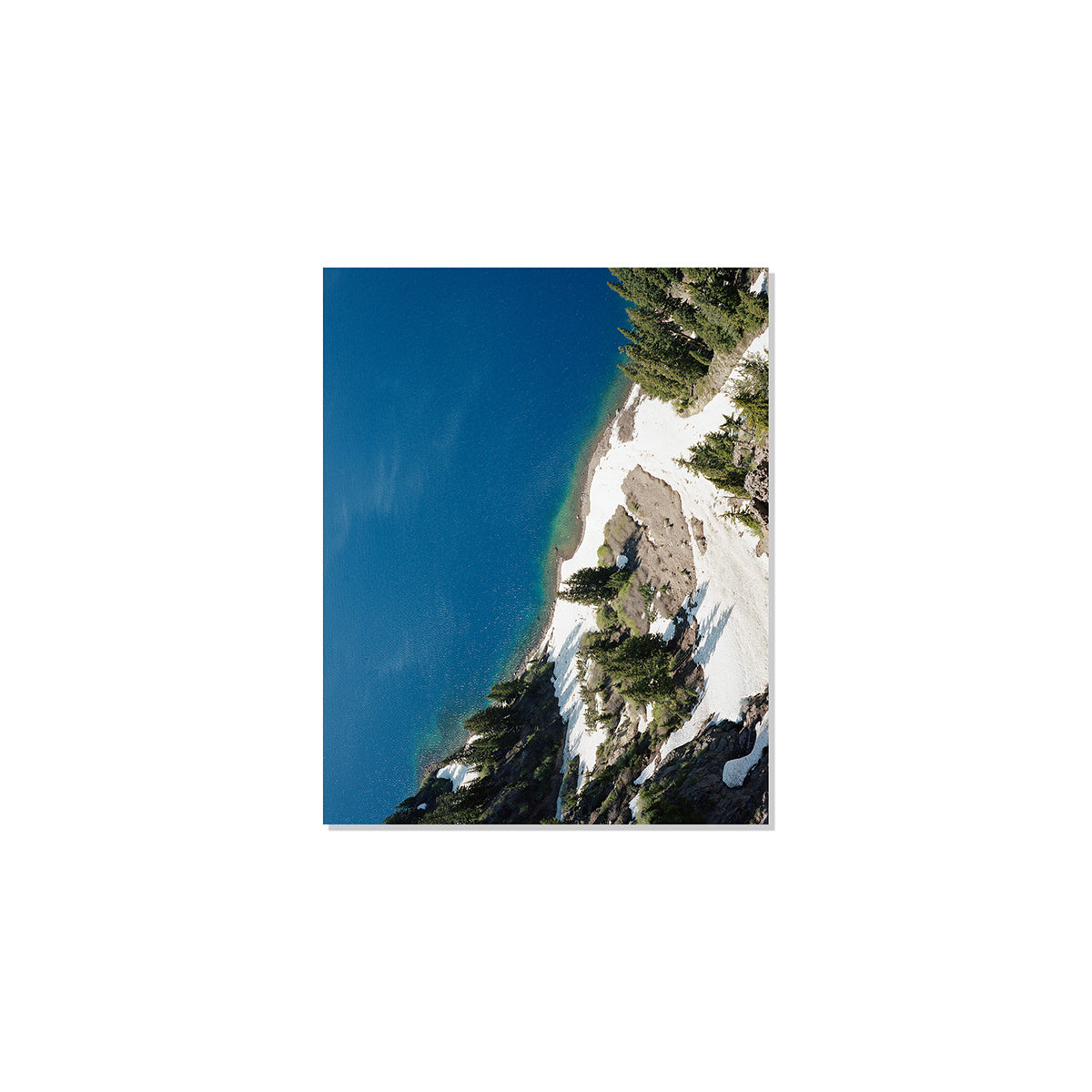 This image has a sense as if it's almost taken from a drone, but it was actually taken from the rim of Crater Lake at "Crater Lake National Park". The lake is actually the remnants of an old volcano, which now hosts a small lake and an island called Wizard Island (quite Tolkien if you ask me). I've always wanted to visit Crater Lake and on whims notice I made myself camp out for one night before meeting a friend in Portland. I must say it was one of the coldest nights of camping that I remember but the view was worth it. This image is a sliver of the volcanos shore line just as the snow began to melt. Although this photograph lives in the California location, Crater Lake is actually in Souther Oregon, once I get the Oregon gallery up we can let it live here :]